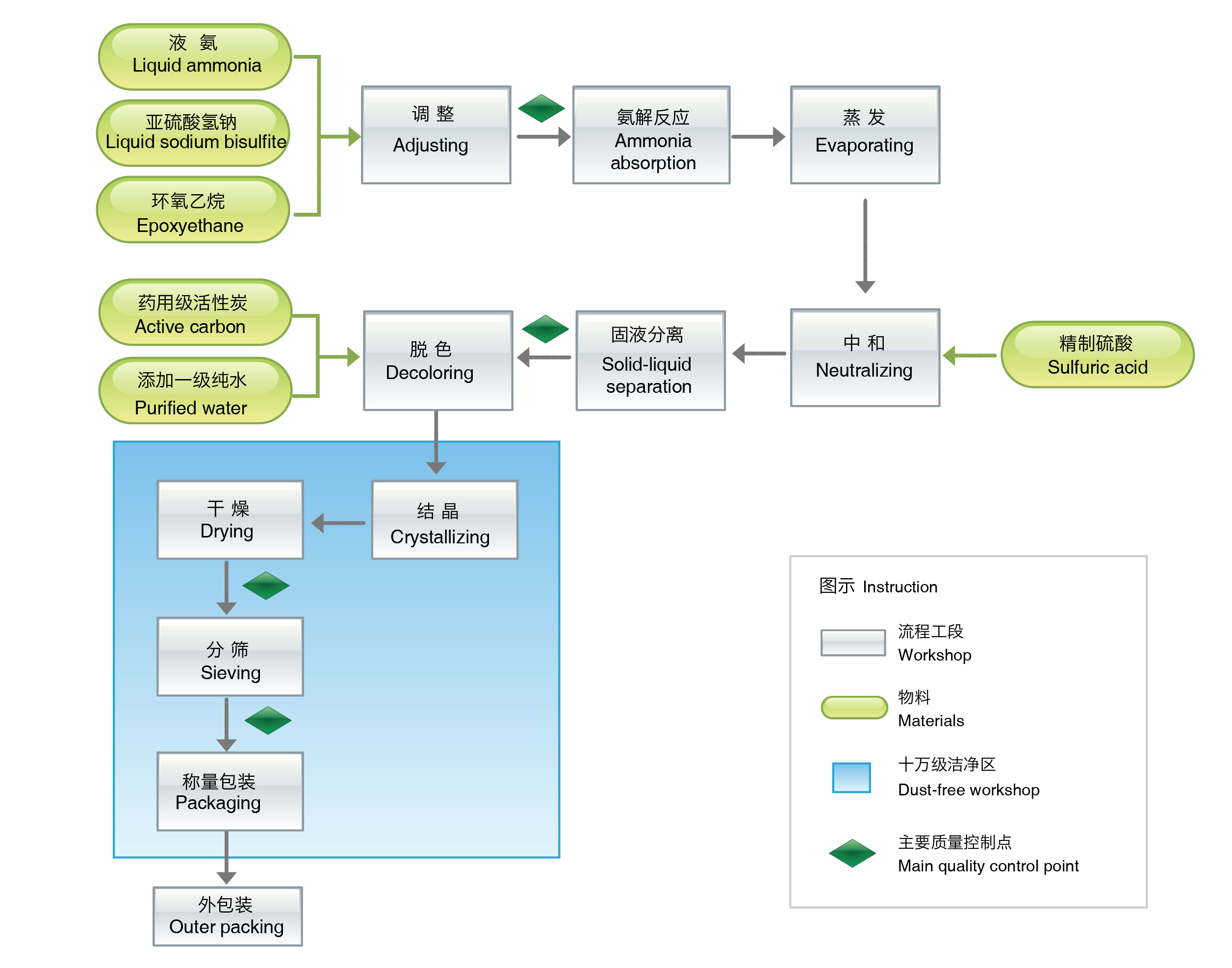 通過(guò)引進(jìn)優(yōu)秀的人才、資金和技術(shù),在新生產(chǎn)工藝“環(huán)氧乙烷法”的基礎(chǔ)上,不斷進(jìn)行技術(shù)改良和工藝創(chuàng)新,最終建成了萬(wàn)噸級(jí)牛磺酸的生產(chǎn)規(guī)模。 引進(jìn)先進(jìn)的生產(chǎn)設(shè)備,齊備的精密分析檢測(cè)儀器。從原料的采購(gòu)入廠到最終的產(chǎn)品出庫(kù), 從最小的到最大的生產(chǎn)單位, 所有車間崗位都是在全程監(jiān)控下完成作業(yè)的。 ??